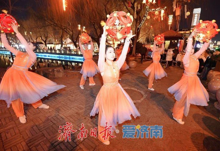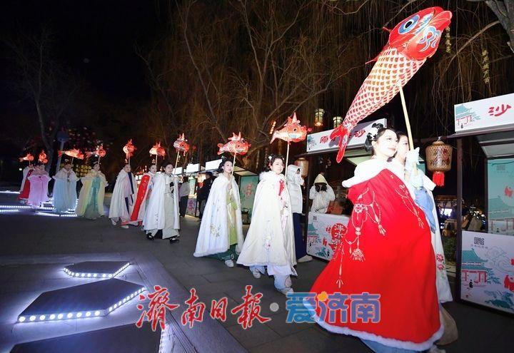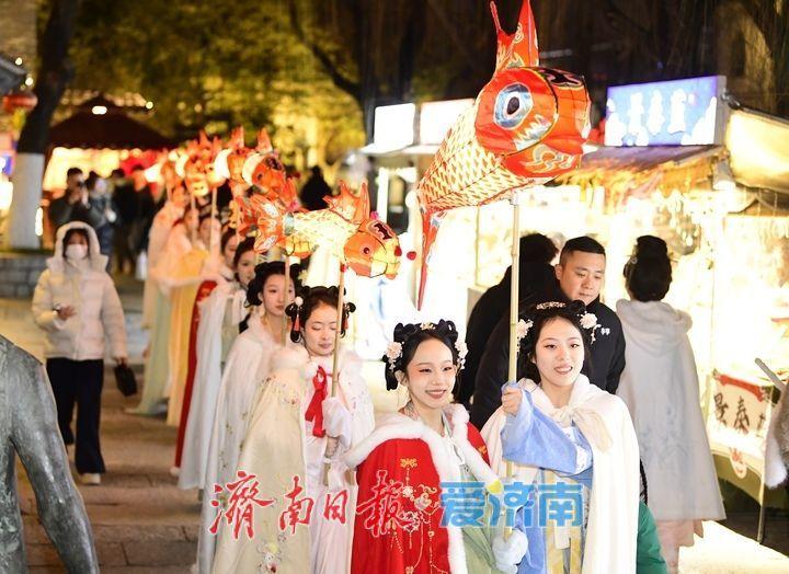 2月9日晚,在济南明府城片区,一场“鱼灯道贺巡游”“快哉清照”和“滚灯夜舞”扮演在曲水亭街和百花洲畔进行,蛊惑了广漠夜游老街巷的市民旅客安身抚玩,为夜幕中灯火妍丽的泉城增添了浓浓年味儿。