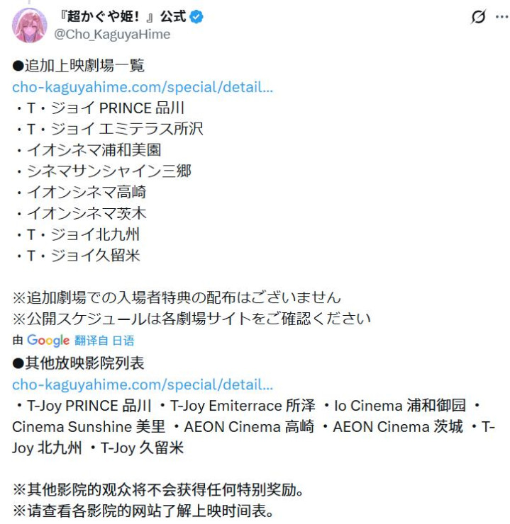 从上头的图片不错看出,将有8家影院不绝上映,固然,至于特典什么的,可能也会有所不同吧(终末就看阿宅们的手速呀)。总之,但愿诸君阿宅们不要火暴,齐会看到(有)呀。